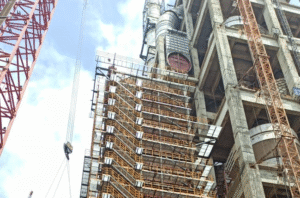 This image captures a major section of an industrial process plant under construction, featuring the...